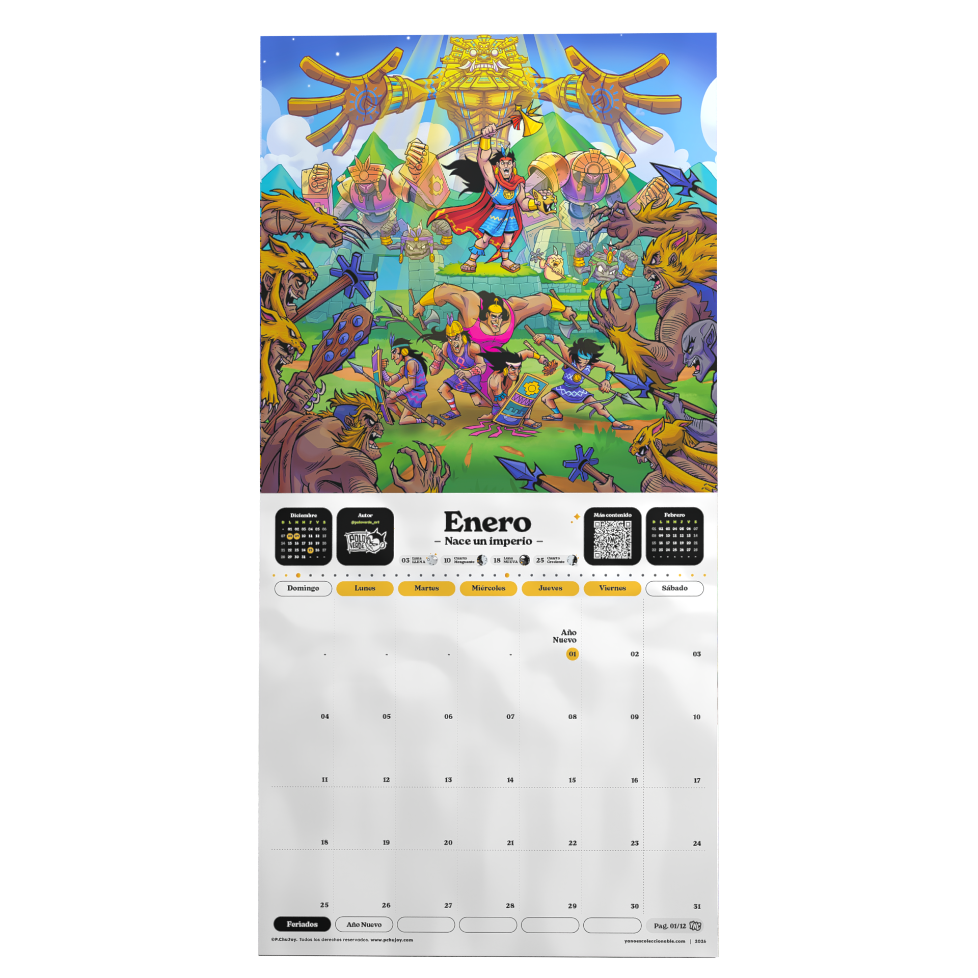El Calendario 2026: “PERÚ ETERNO: Héroes y Fiestas” busca revalorar el sentido de identidad de cada peruano acercándose a aquellos elementos que ya nos producen identidad como lo son nuestras aficiones. Queremos que en cada ilustración te lleves la sensación de estar viendo un trabajo colaborativo que involucra pasión, amor y dedicación.